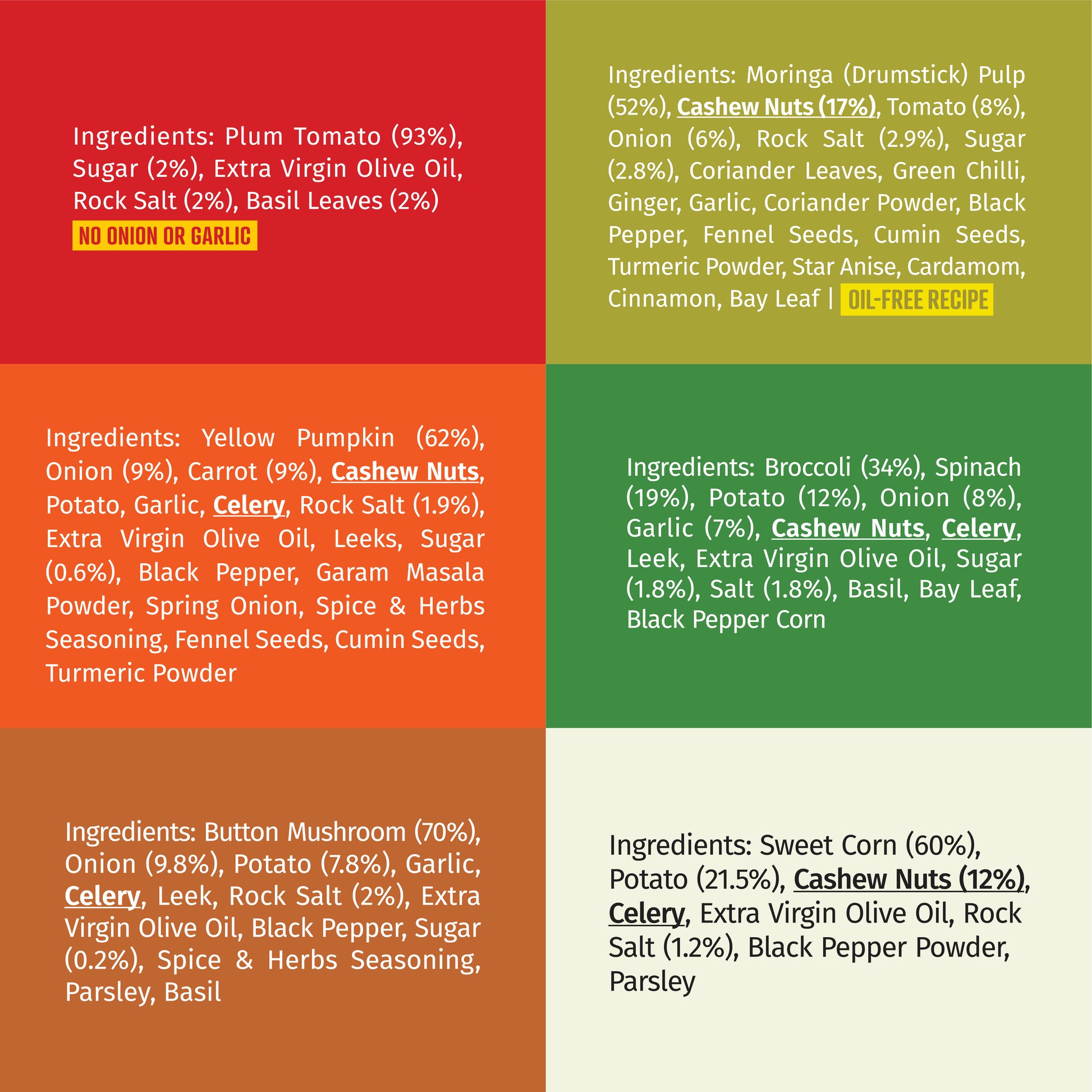 Contains Spinach & Broccoli Soup, Curried Pumpkin Soup, Cashew & Moringa Soup, Pepper Mushroom Soup, Italian Basil & Tomato Soup, Creamy Sweet Corn Soup